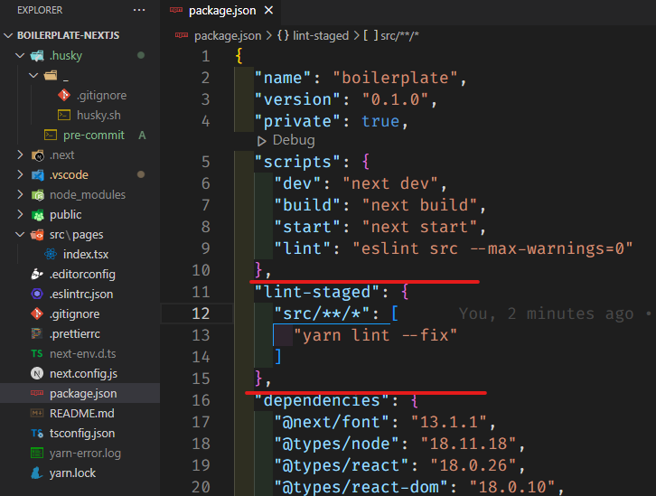 A dinâmica é a seguinte aqui ao comitar o husky através da configuração do arquivo pre-commit executa o comando lint-staged que foi configurado no package.json, o lint-staged vasculha tudo dentro da src e se encontrar algum erro ele tenta fixar com lint –fix e caso não consiga ele exibe um erro no commit mesmo que este erro seja leve, pois ainda no arquivo package.json lembra que nós configuramos um comando em scripts que é assim “lint”: “eslint src –max-warnings=0”, esse comando por menor que seja o erro encontrado pelo ESLint ele quebra a aplicação.