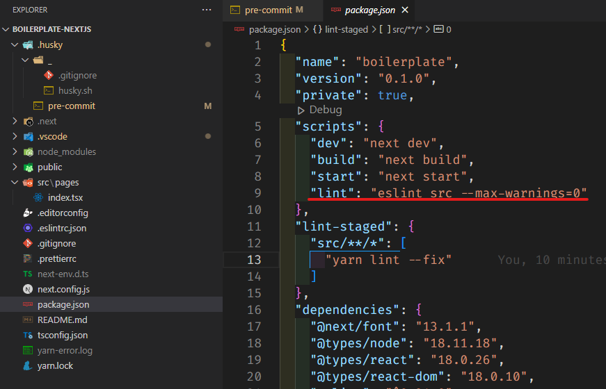 Só vou pedir que você adicione mais uma coisa para assegurar que tudo vai funcionar como o esperado, vá no seu package.json e adicione esta linha de código “lint”: “eslint src –max-warnings=0” veja a imagem abaixo para facilitar: