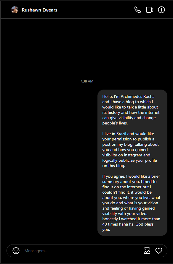 Esta parte é muito difícil pois não encontrei informações sobre o Rushawn, então eu fui no insta dele e mandei um direct, se ele me responder eu alimento esta parte, segue o print.